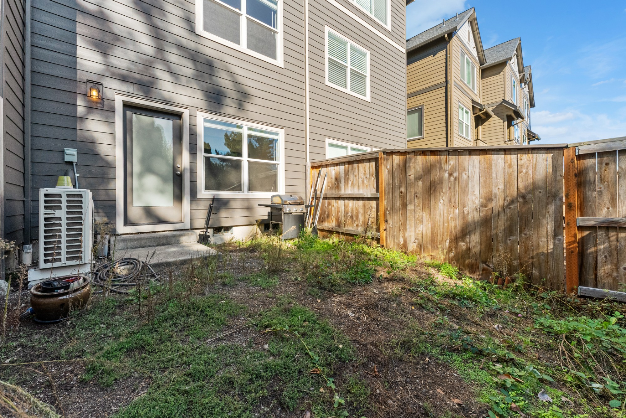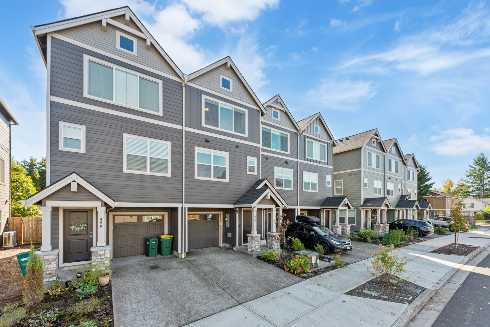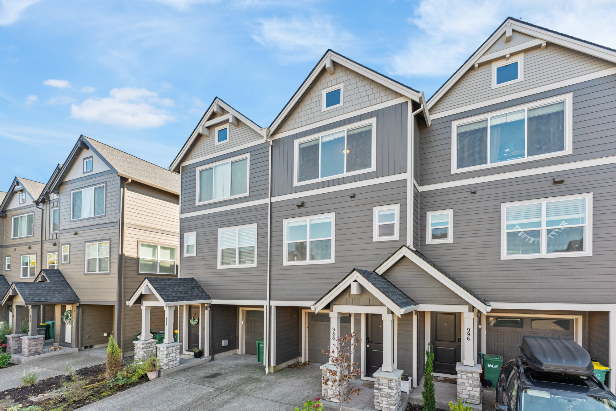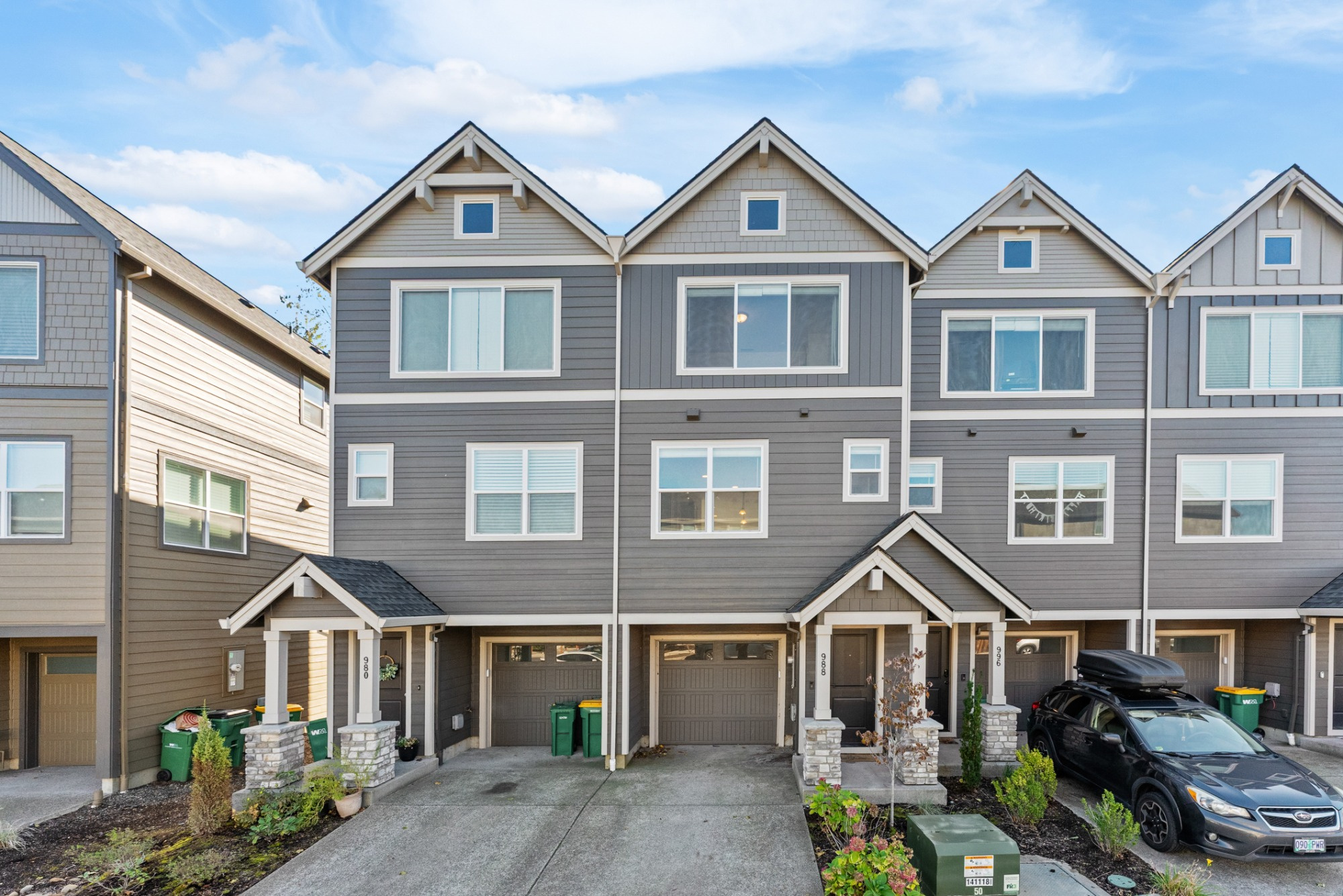 Contemporary row house built in 2023 with 3 bedrooms, 1.1 baths, and 1,303 sq. ft. The main floor features an open layout with laminate flooring, an electric fireplace, and an open kitchen with stainless appliances, granite island, and built-in storage. The upper level includes two bedrooms and a full bath. There is a bonus third bedroom on the lower level that adds flexibility for office or guest use. Attached one-car garage and driveway for additional parking. Low-maintenance fenced yard and the front yard is covered by the HOA and has sprinklers. Efficient systems include mini-split heating/cooling and double-pane windows. The HOA covers exterior maintenance, landscaping, and management. No rental cap means flexibility. Easy access to historic downtown Troutdale, parks, and major routes.