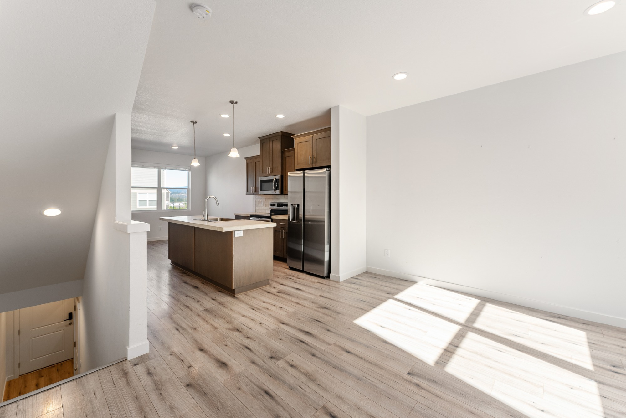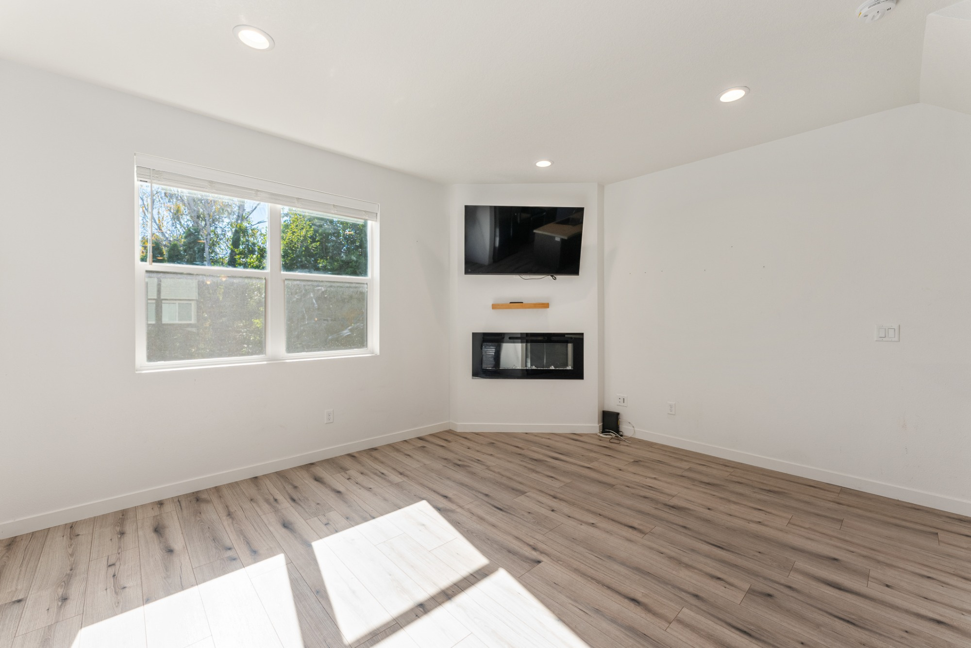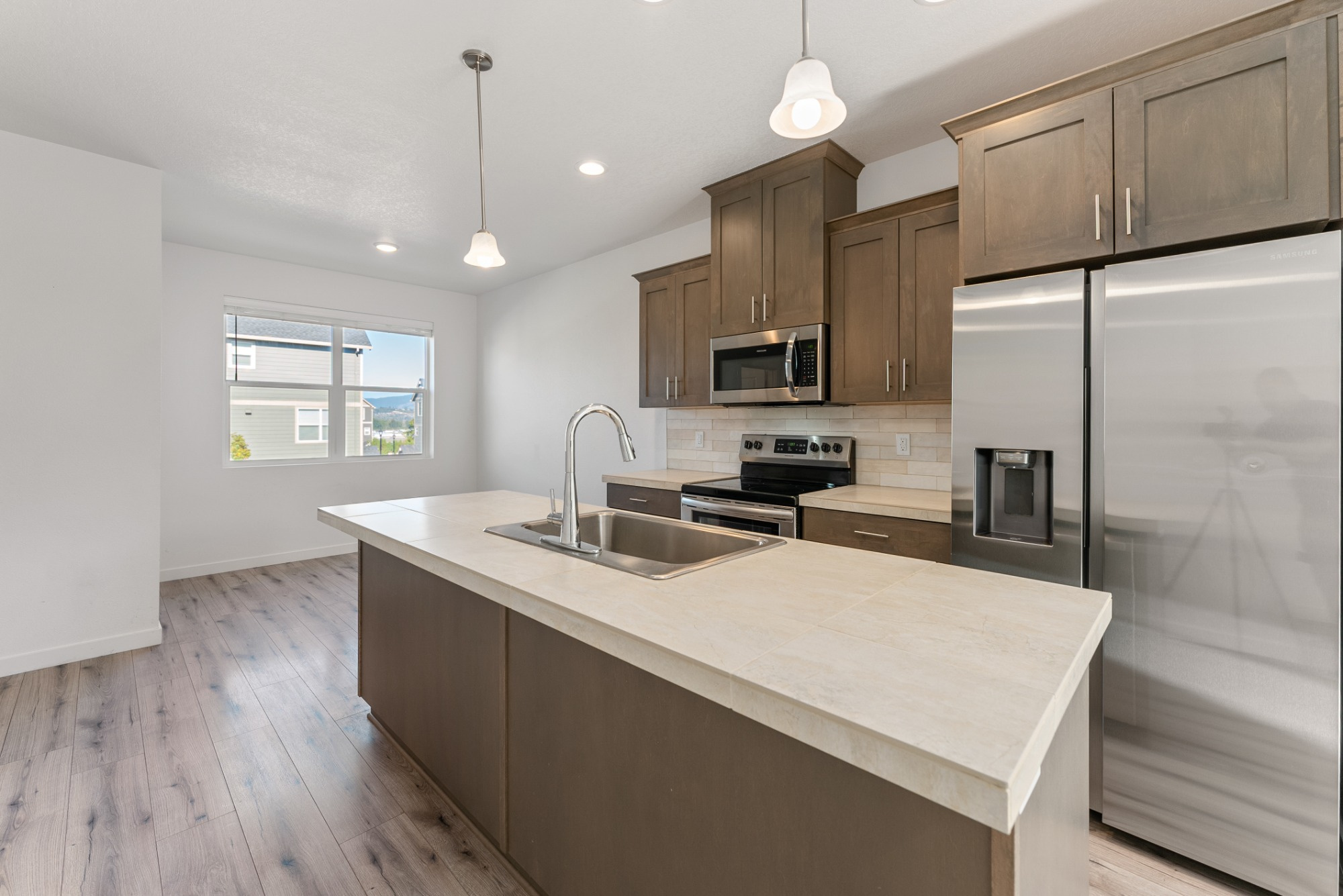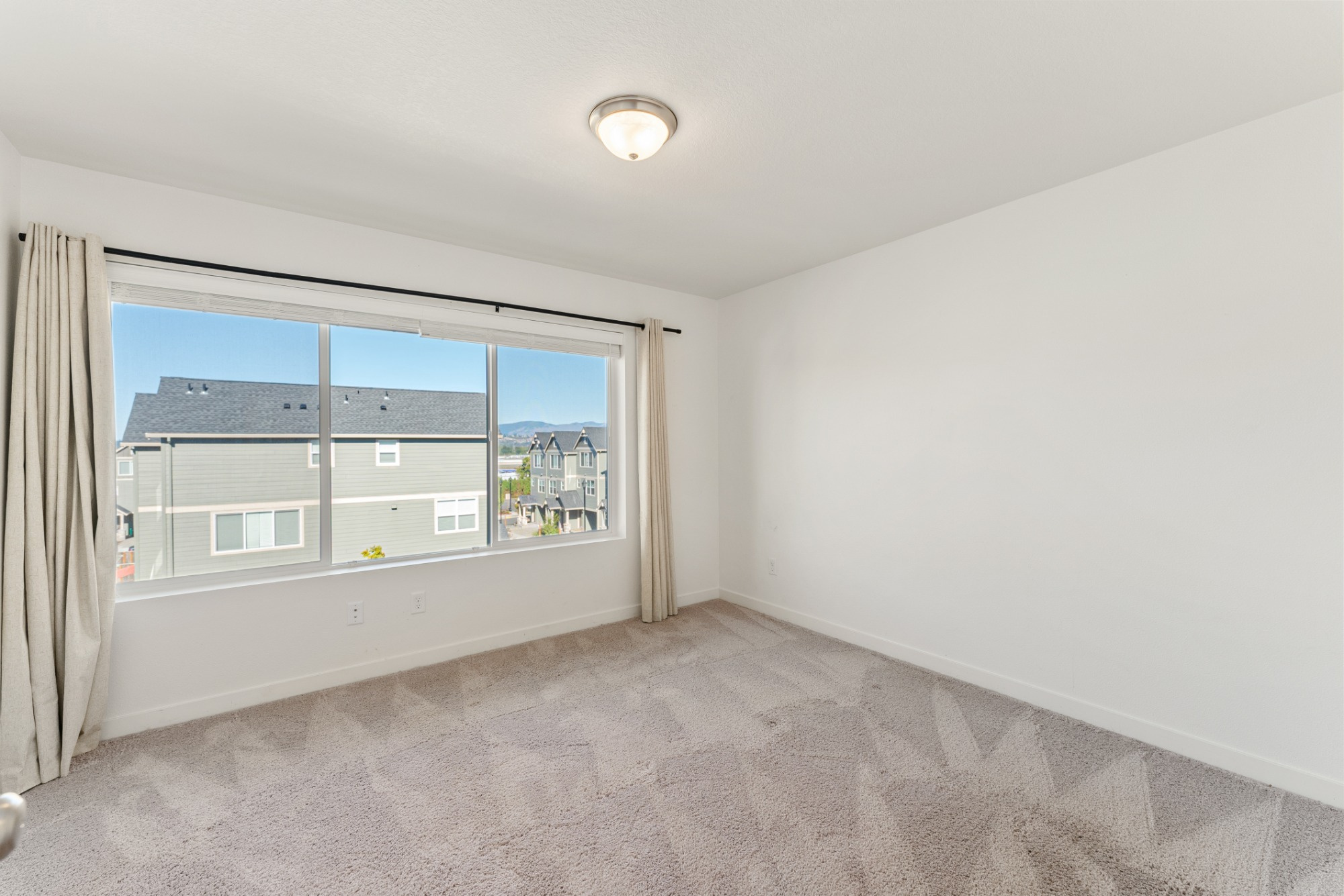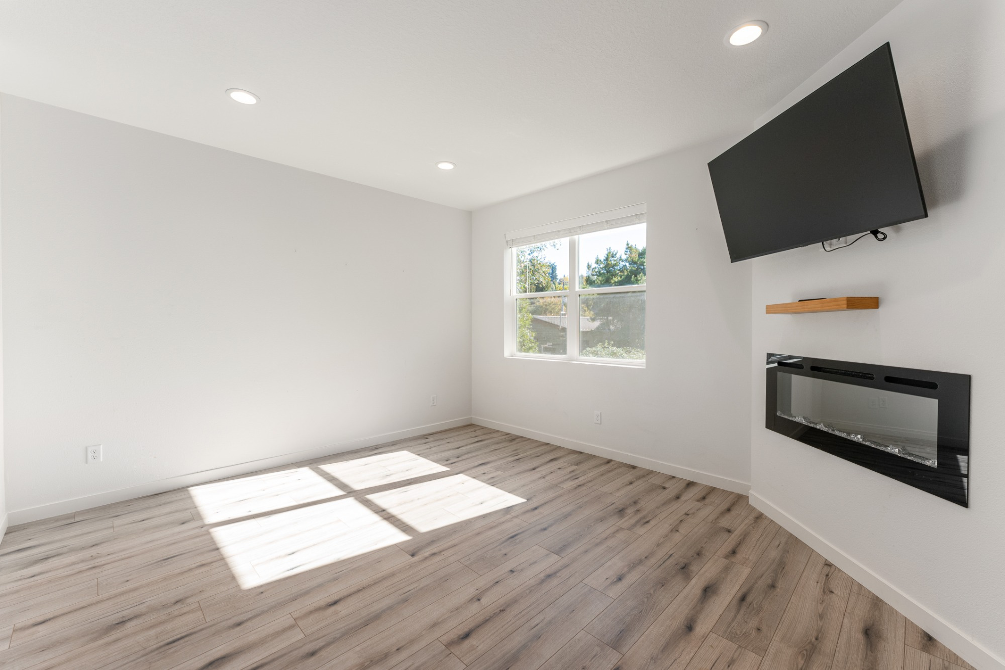 Contemporary row house built in 2023 with 3 bedrooms, 1.1 baths, and 1,303 sq. ft. The main floor features an open layout with laminate flooring, an electric fireplace, and an open kitchen with stainless appliances, granite island, and built-in storage. The upper level includes two bedrooms and a full bath. There is a bonus third bedroom on the lower level that adds flexibility for office or guest use. Attached one-car garage and driveway for additional parking. Low-maintenance fenced yard and the front yard is covered by the HOA and has sprinklers. Efficient systems include mini-split heating/cooling and double-pane windows. The HOA covers exterior maintenance, landscaping, and management. No rental cap means flexibility. Easy access to historic downtown Troutdale, parks, and major routes.