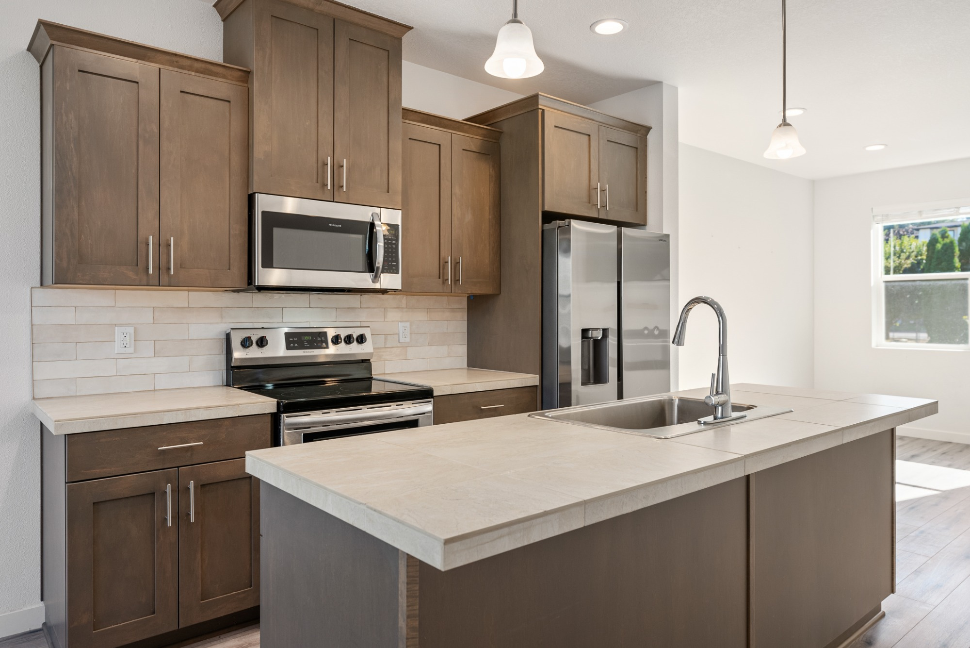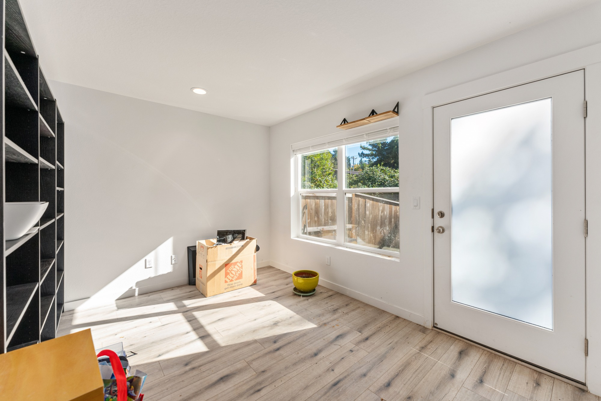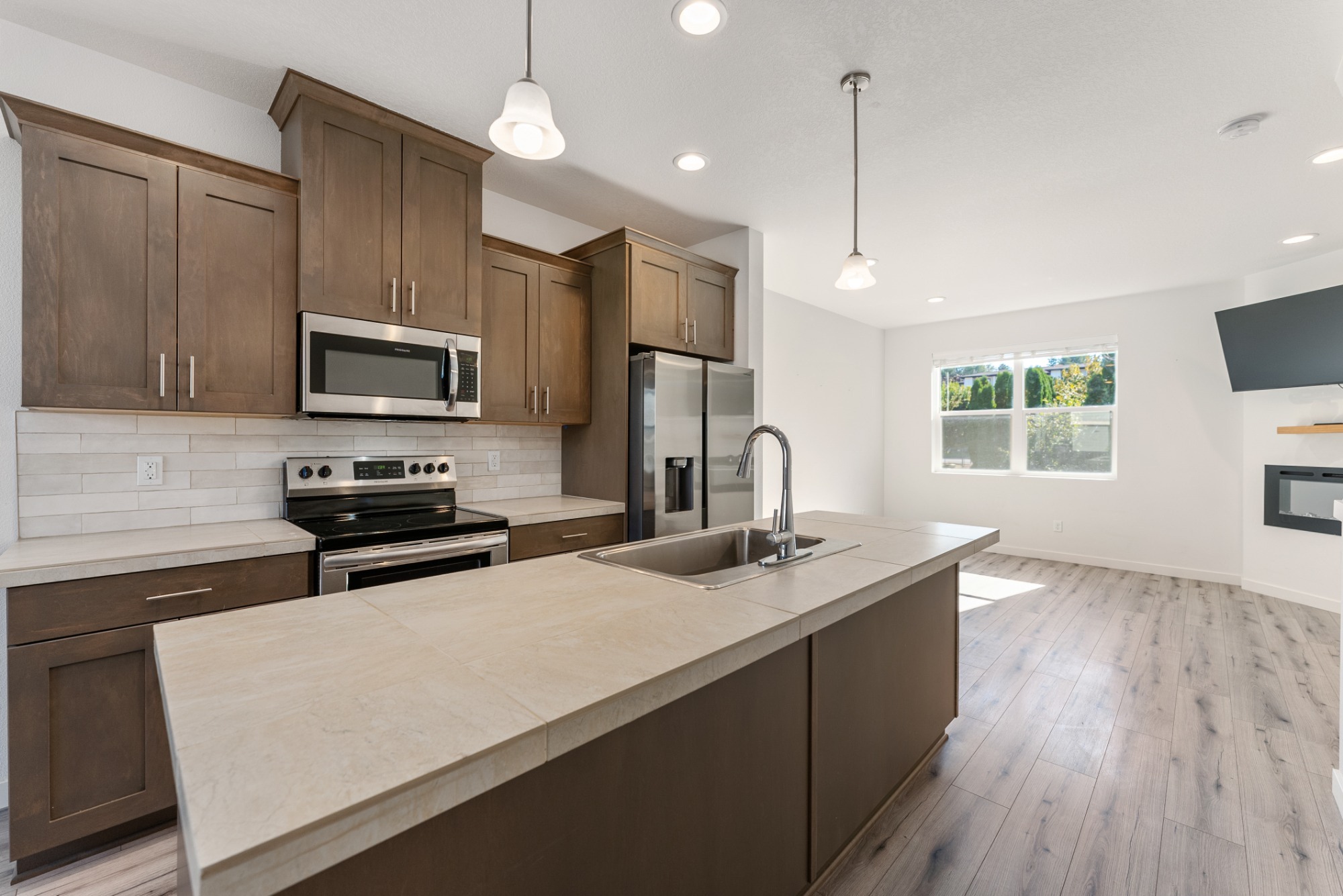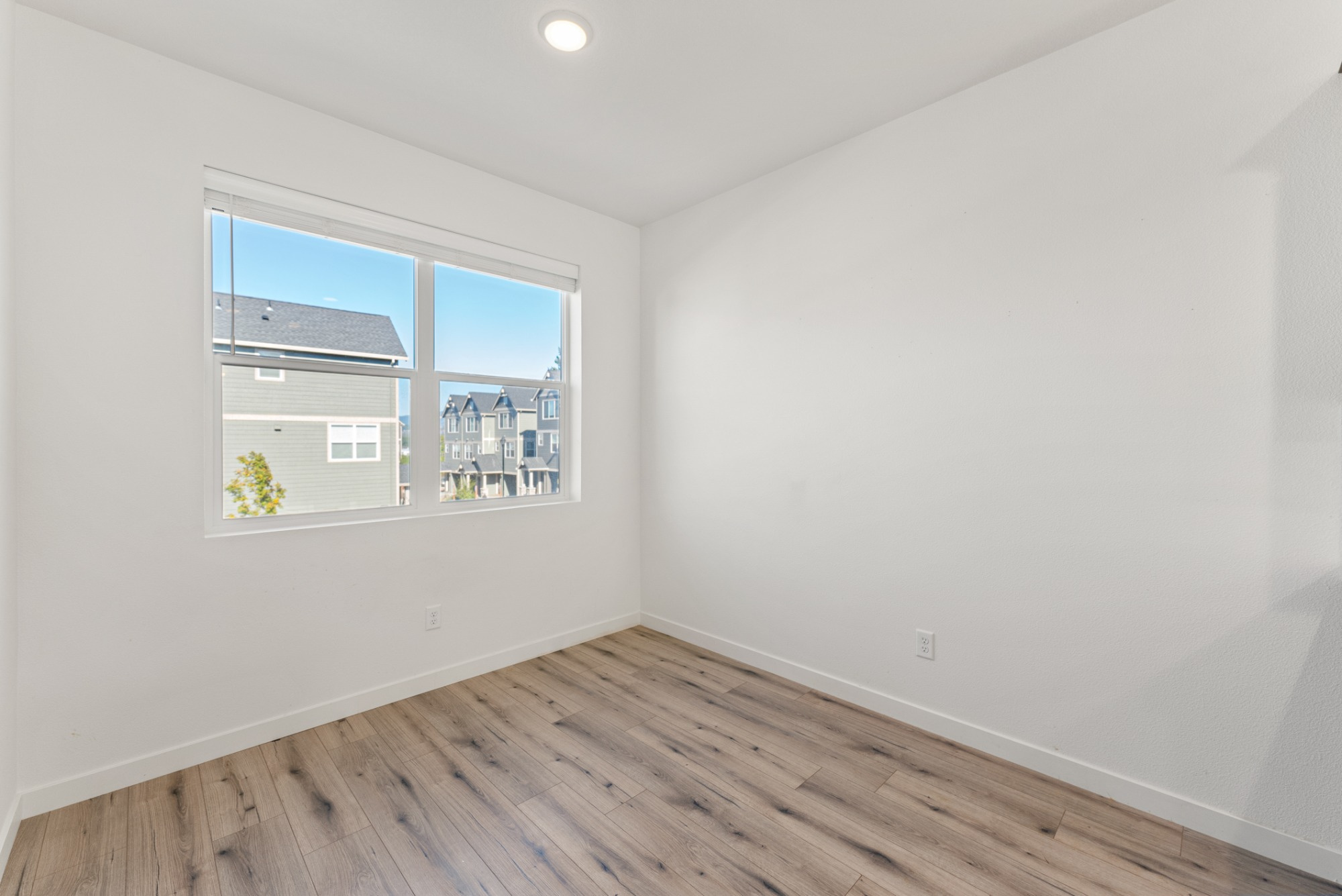 Contemporary row house built in 2023 with 3 bedrooms, 1.1 baths, and 1,303 sq. ft. The main floor features an open layout with laminate flooring, an electric fireplace, and an open kitchen with stainless appliances, granite island, and built-in storage. The upper level includes two bedrooms and a full bath. There is a bonus third bedroom on the lower level that adds flexibility for office or guest use. Attached one-car garage and driveway for additional parking. Low-maintenance fenced yard and the front yard is covered by the HOA and has sprinklers. Efficient systems include mini-split heating/cooling and double-pane windows. The HOA covers exterior maintenance, landscaping, and management. No rental cap means flexibility. Easy access to historic downtown Troutdale, parks, and major routes.